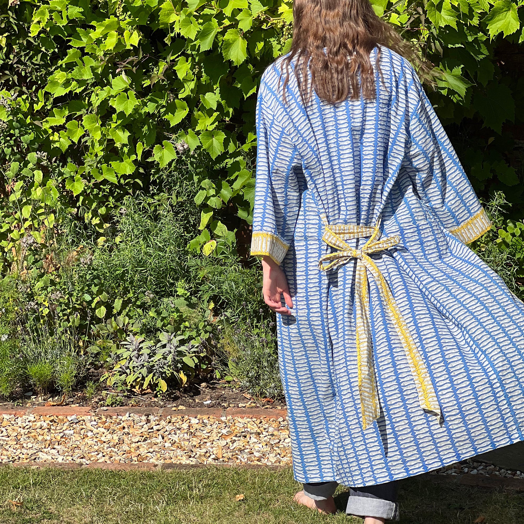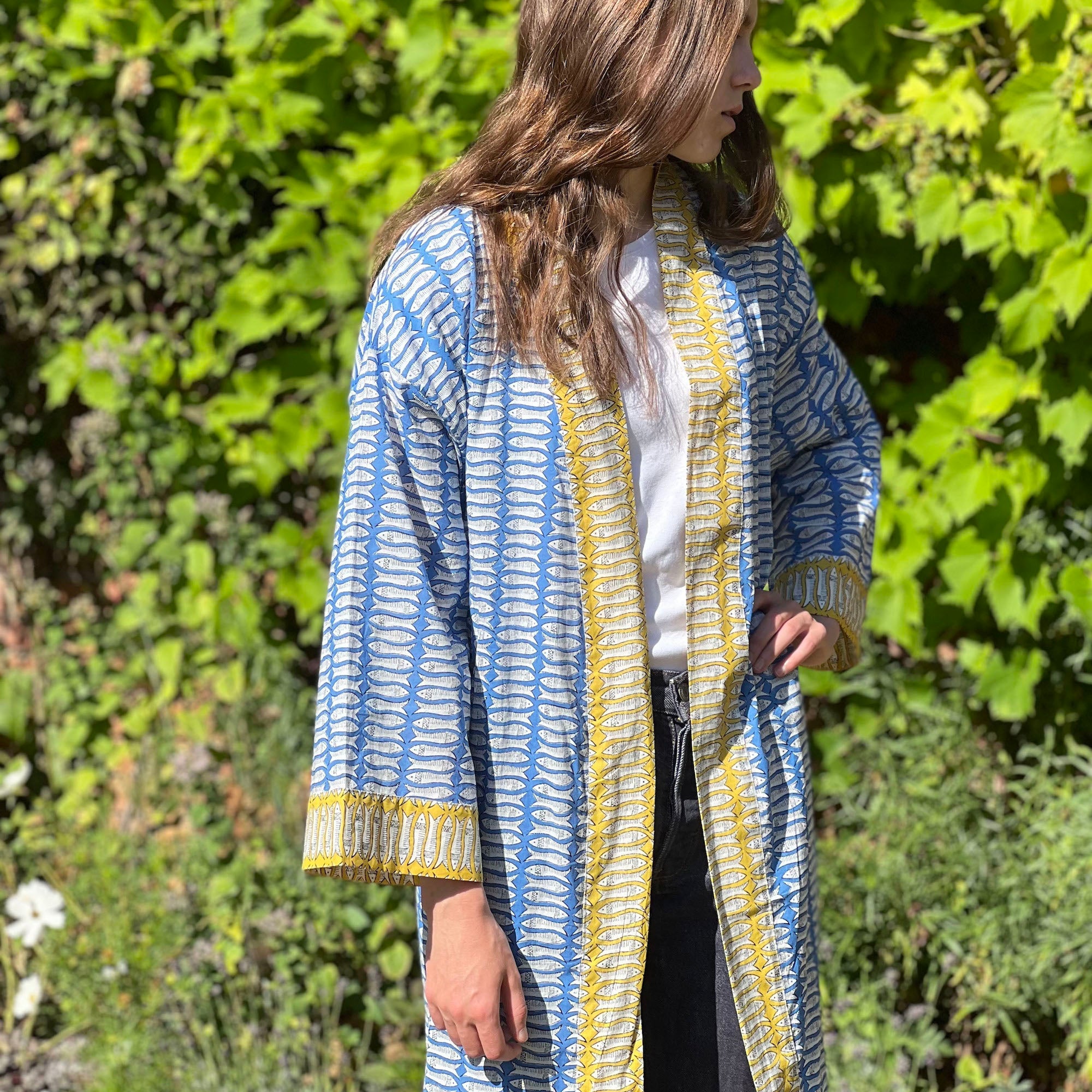 Cotton kimono made from our unique fish print inspired by Indian block print.