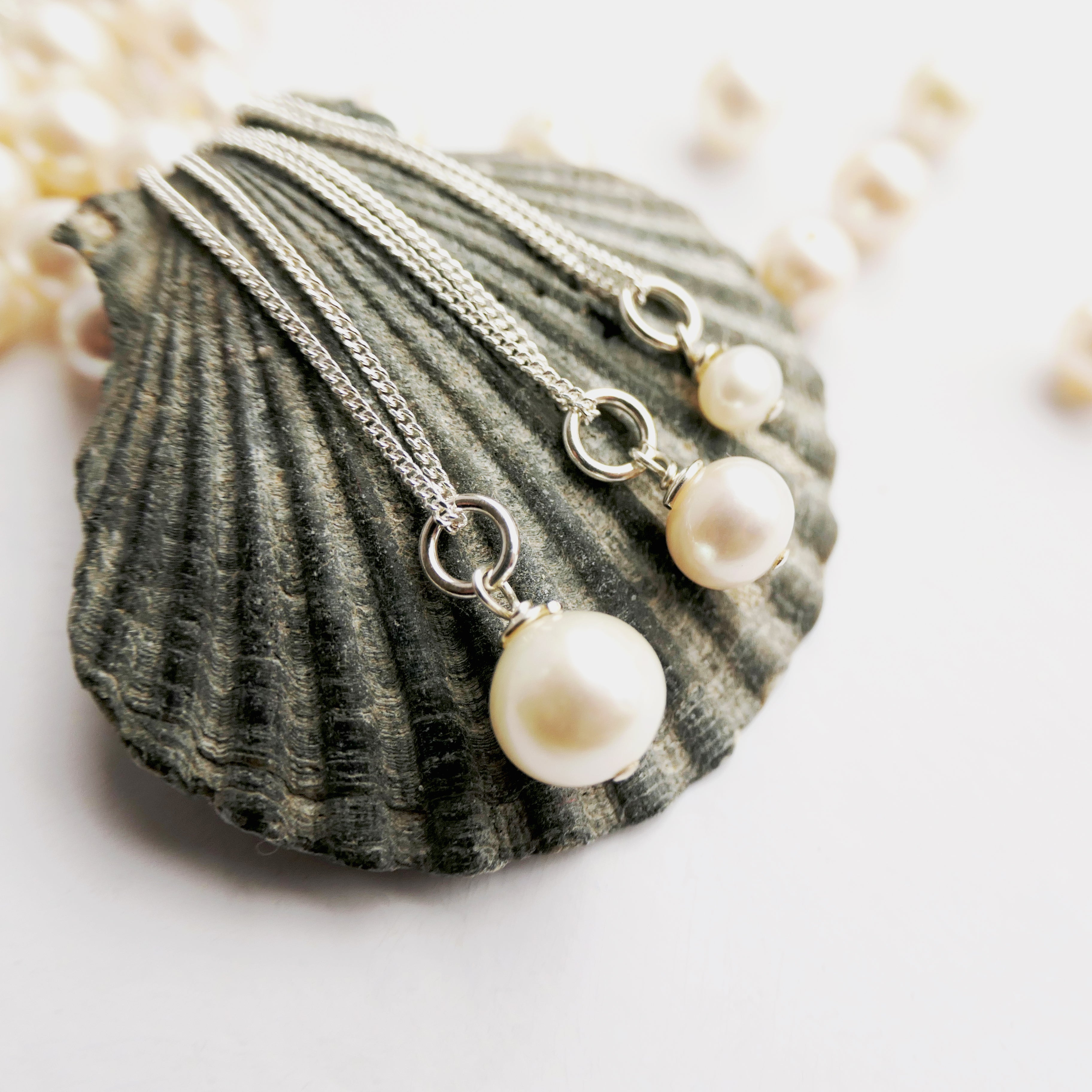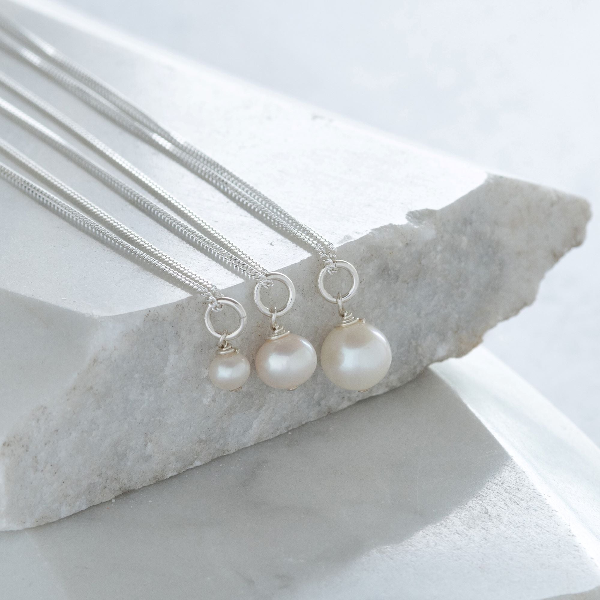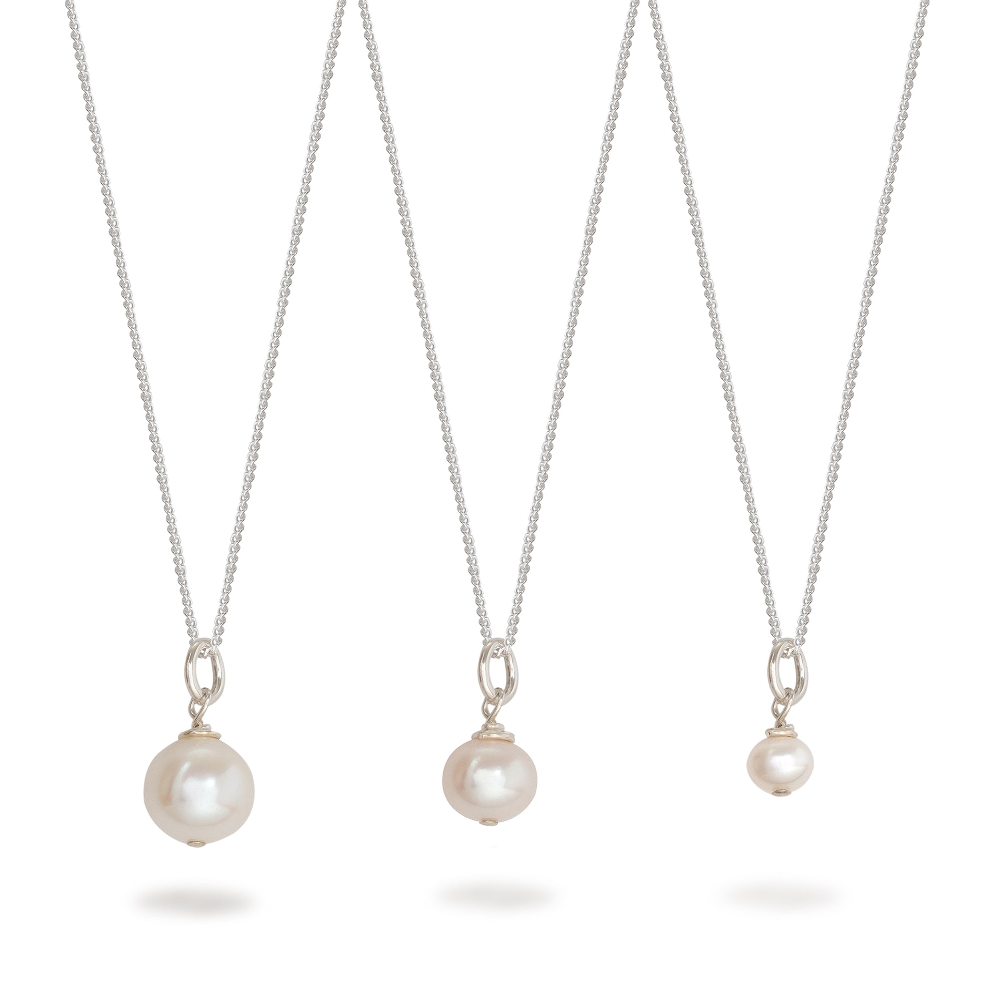 The necklace comes boxed and on an 18" curb chain. Small pearl measures approx 4mm, medium pearl measures approx 6mm, large pearl measures approx 8mm.