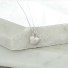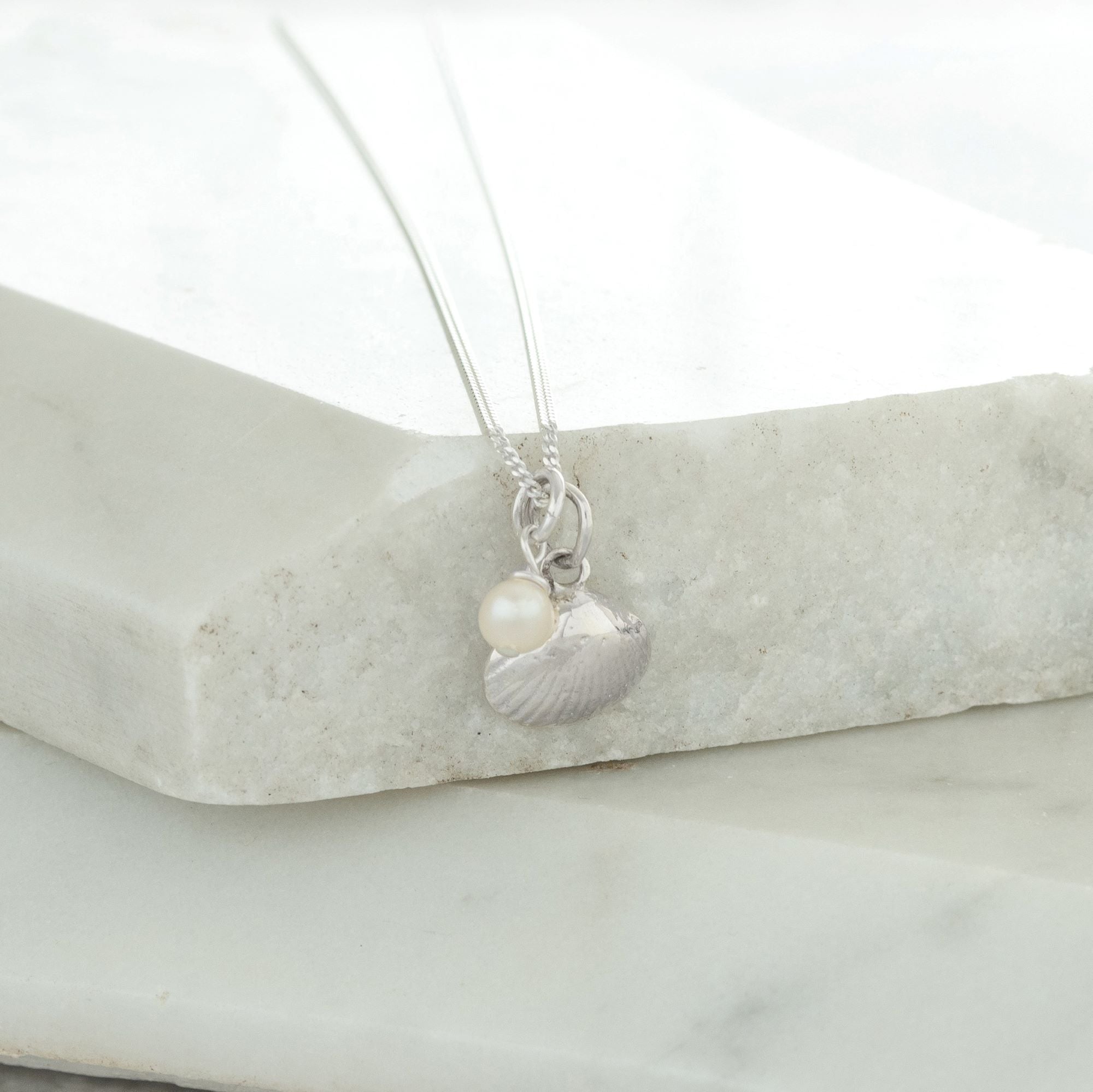 This dainty necklace features our tiny shell charm and a freshwater pearl.