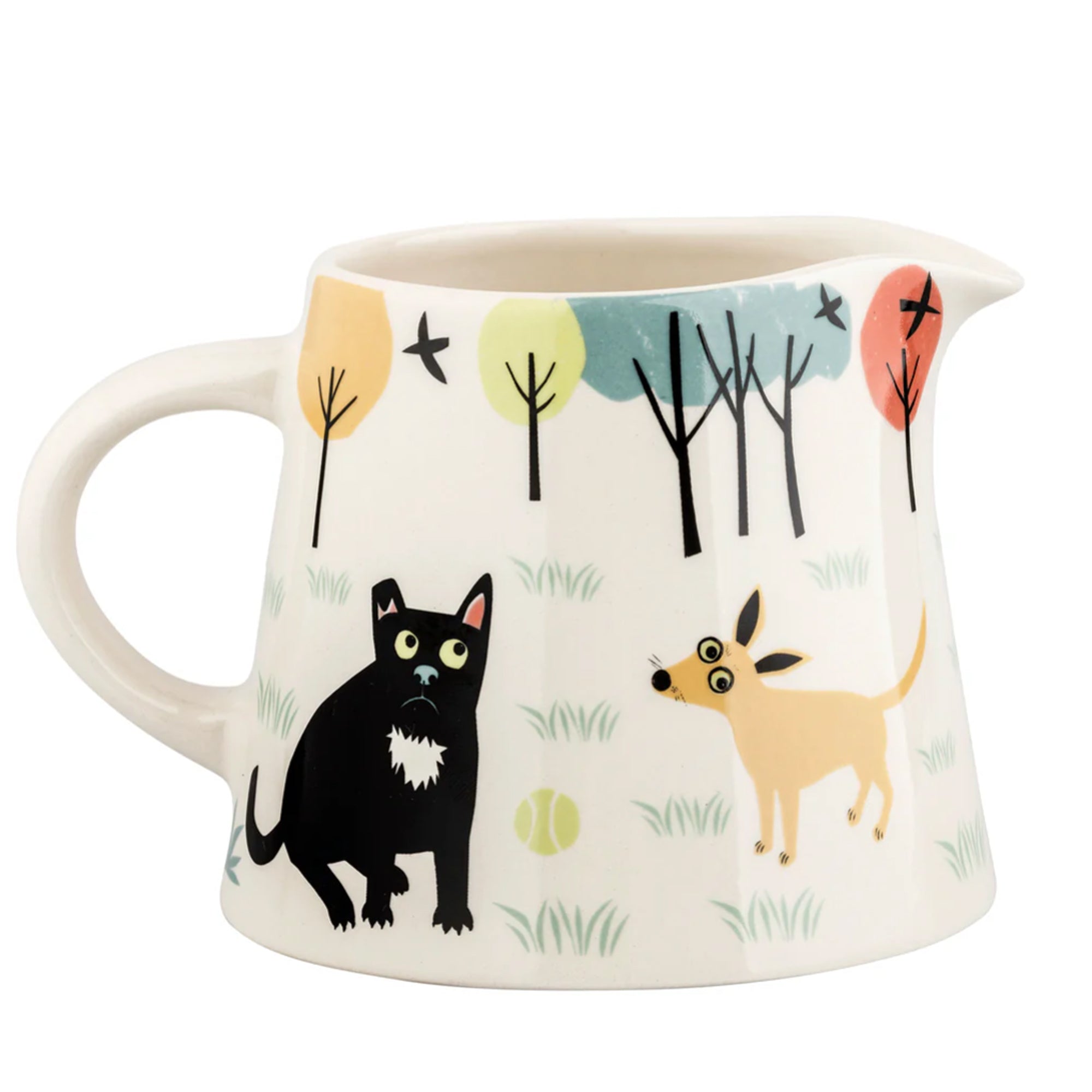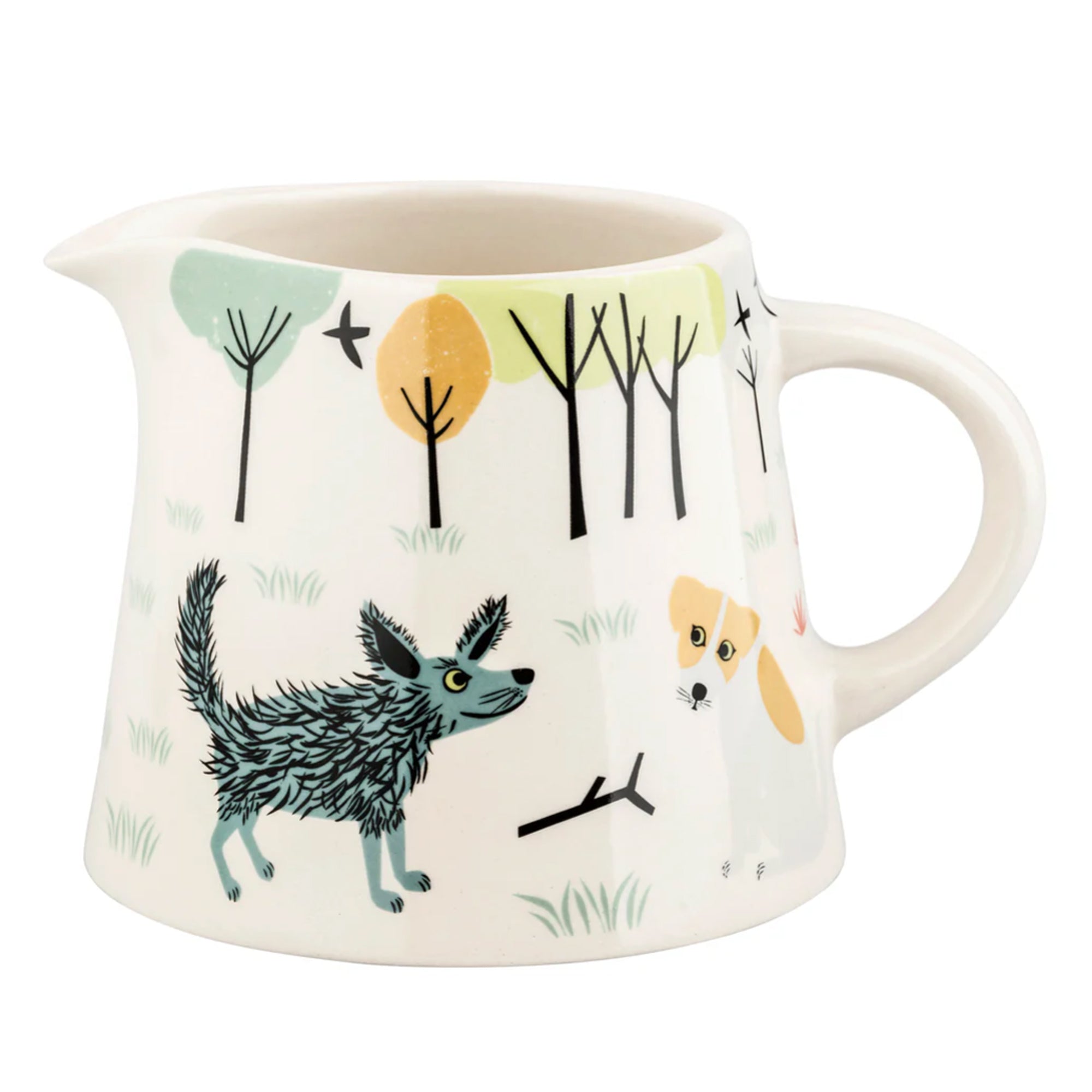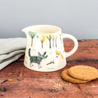 A handmade milk jug by Hannah Turner decorated with her charmingly quirky illustrations which wrap around the piece.