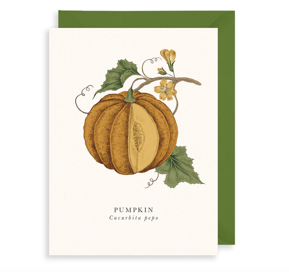 A Beautiful greeting card with a delicate botanical style illustration of a pumpkin, with the English and Latin title detailed below.