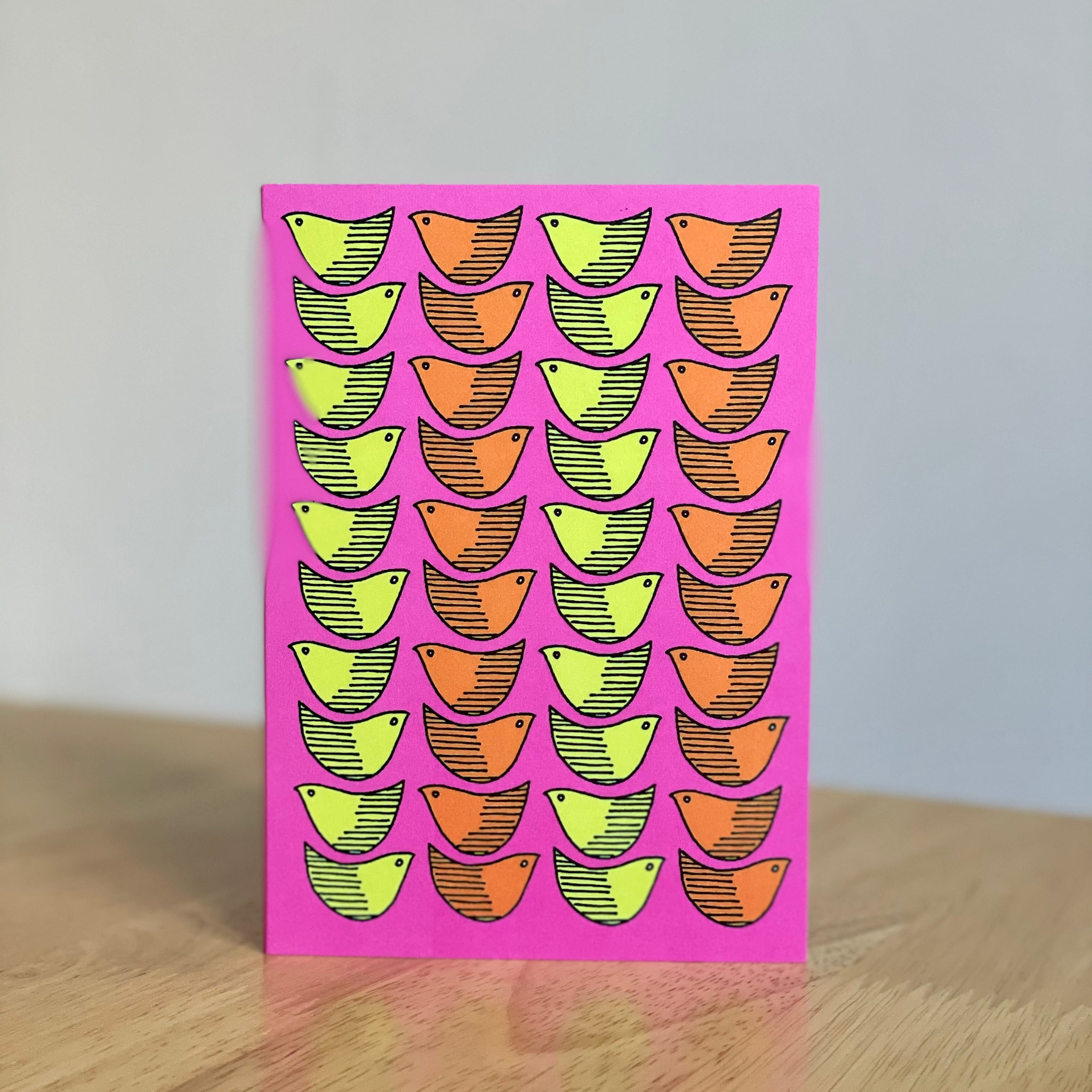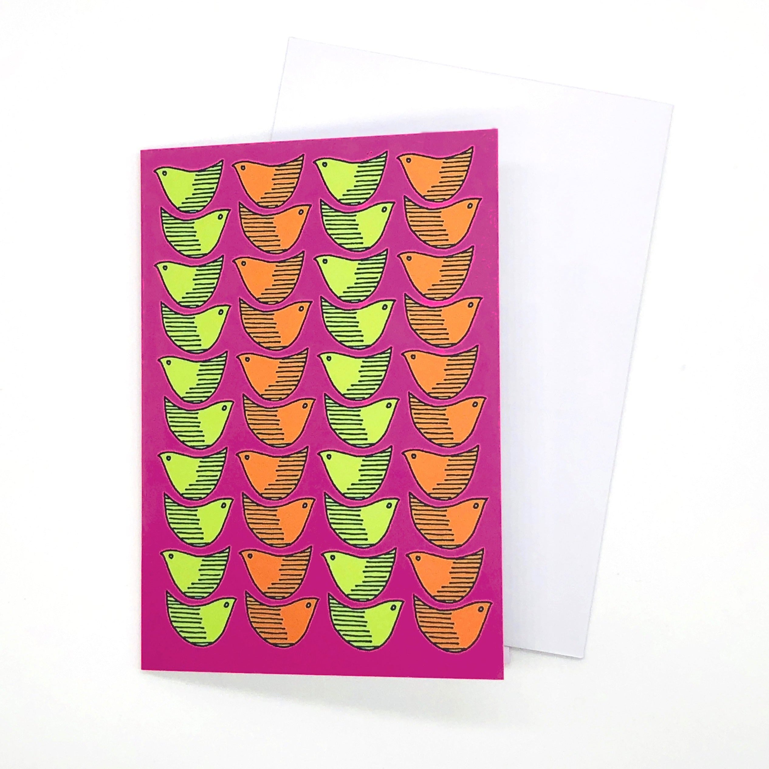 A striking everyday greetings card featuring our Lime Tree Design birds in orange and lime green on a bright pink background.