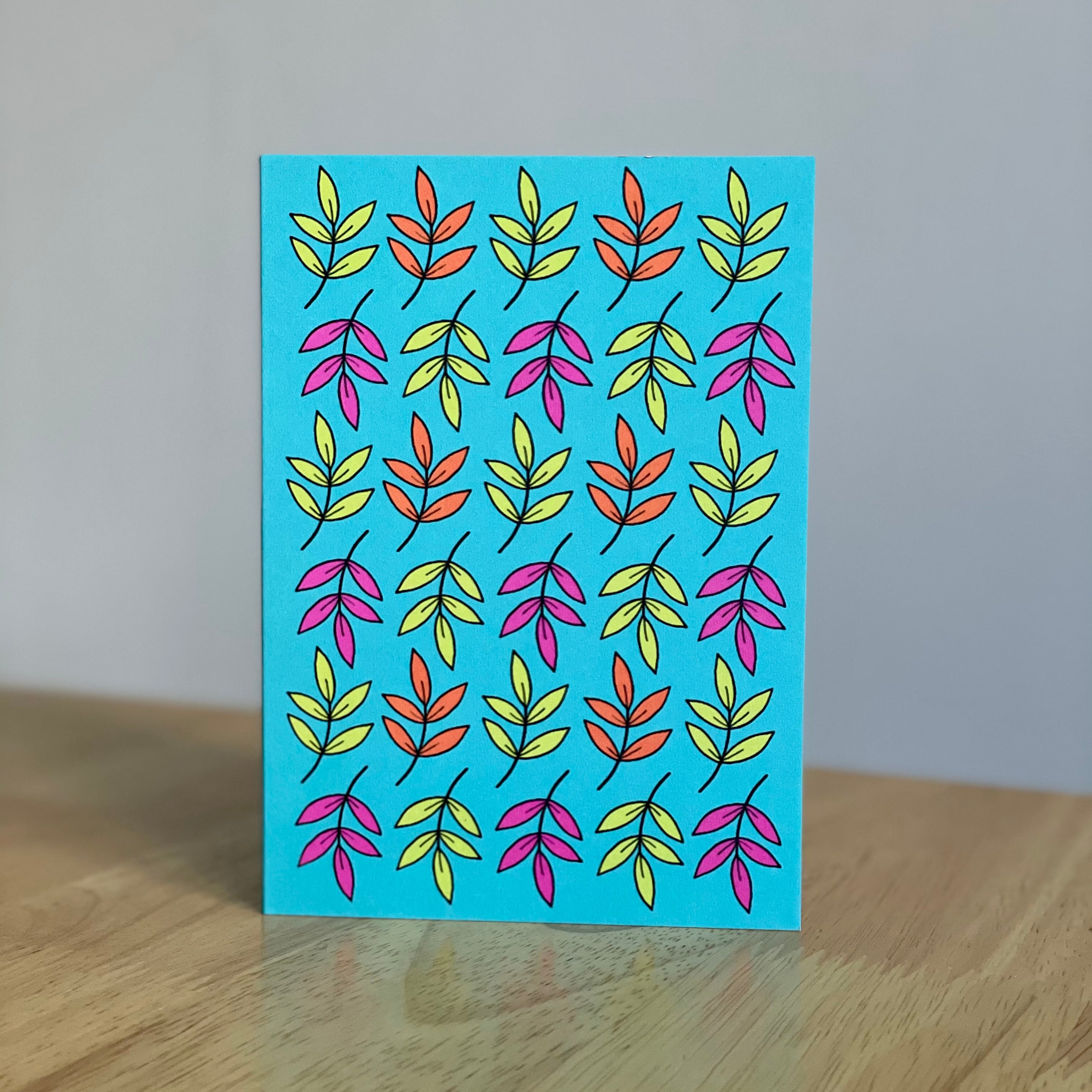 A striking everyday greetings card featuring a pattern of falling leaves in vibrant pink, orange and green on a turquoise background.