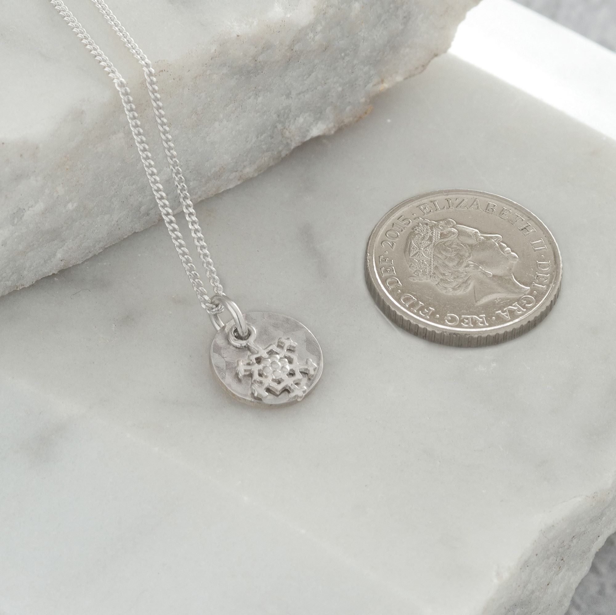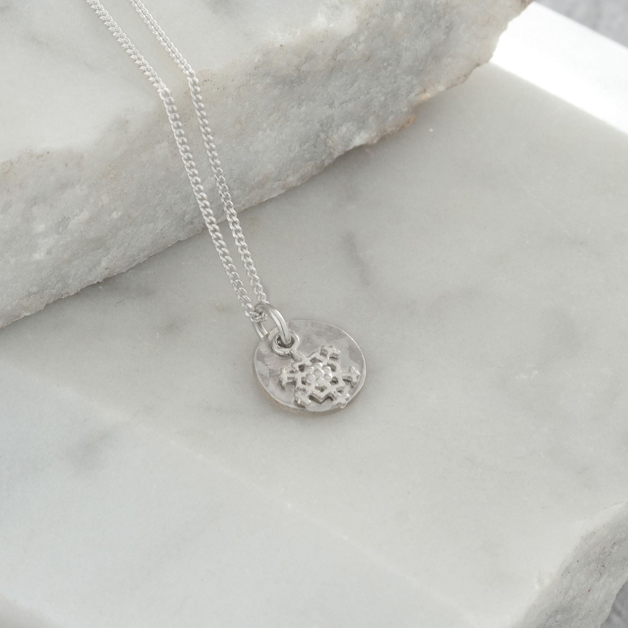 Mini Hammered Disc with Snowflake Necklace Sterling Silver