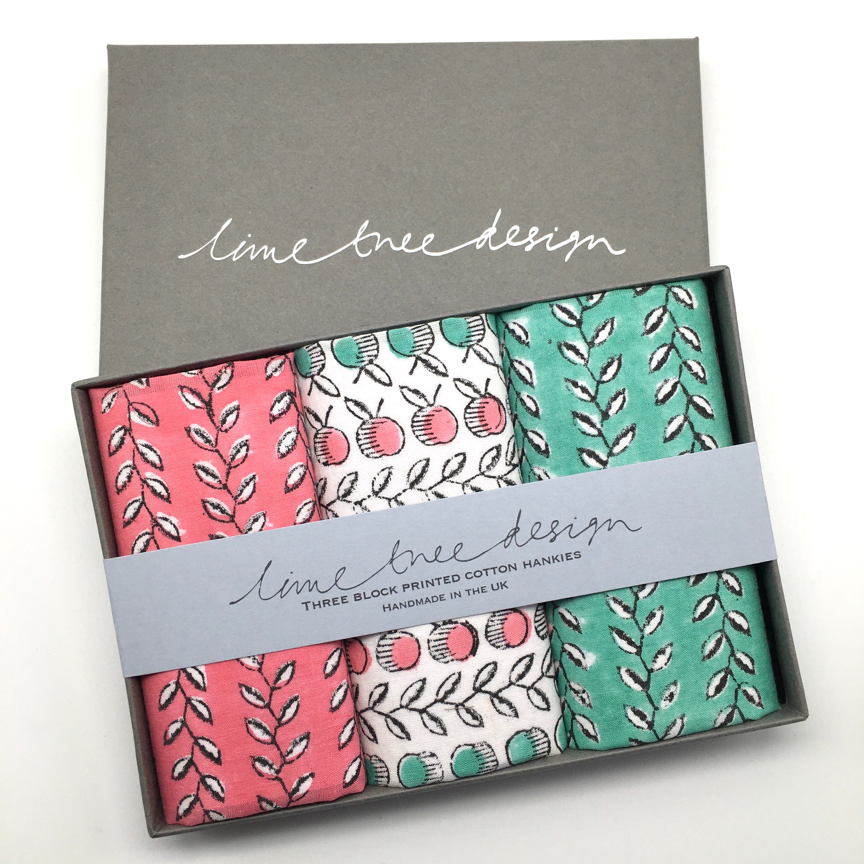 Gift box of three coordinating cotton hankies in fun summer colours.
