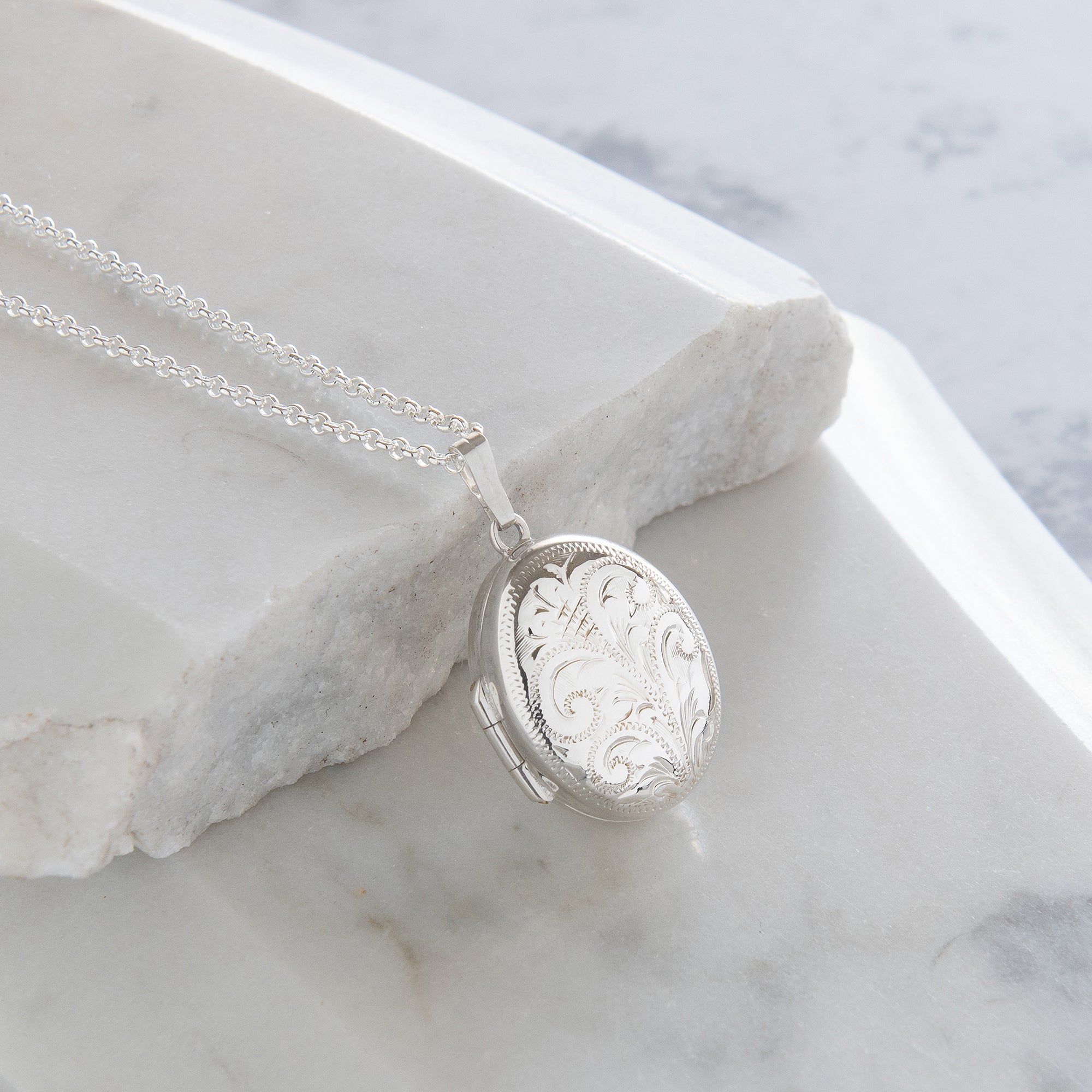 This sterling silver necklace features our most popular oval locket with a hand engraved pattern on the front.