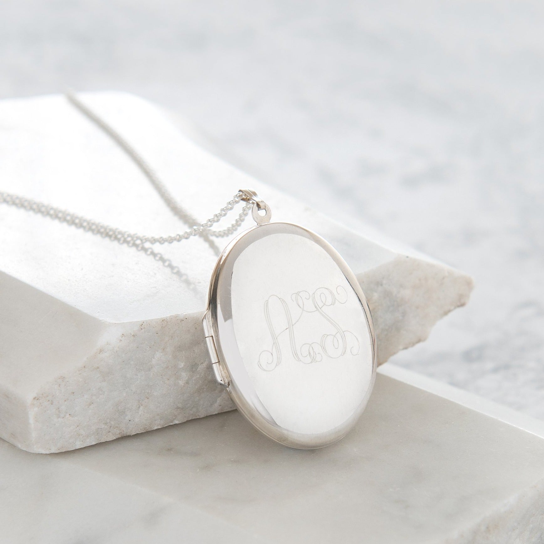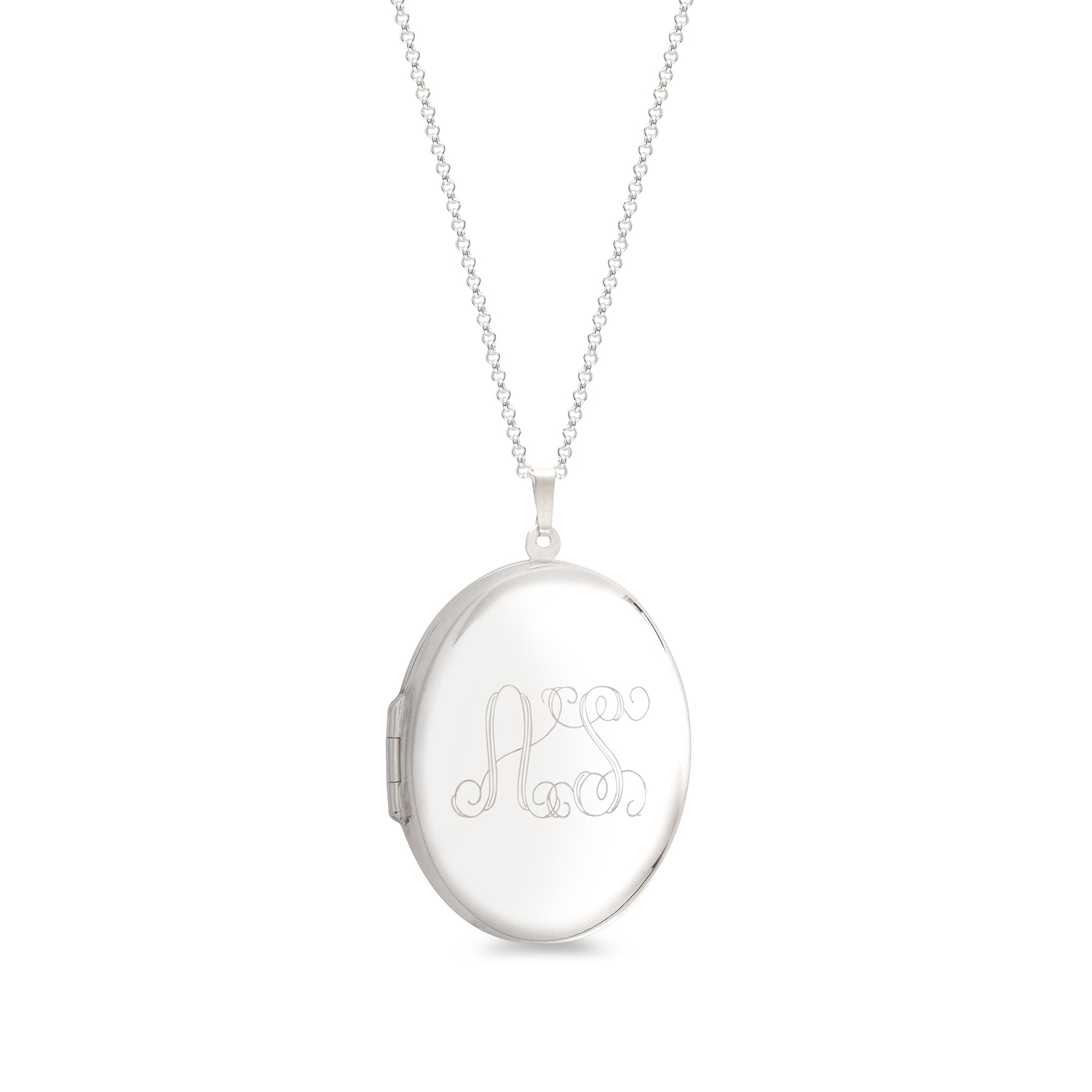 This sterling silver necklace features our extra large locket with an optional engraved monogram on the front.