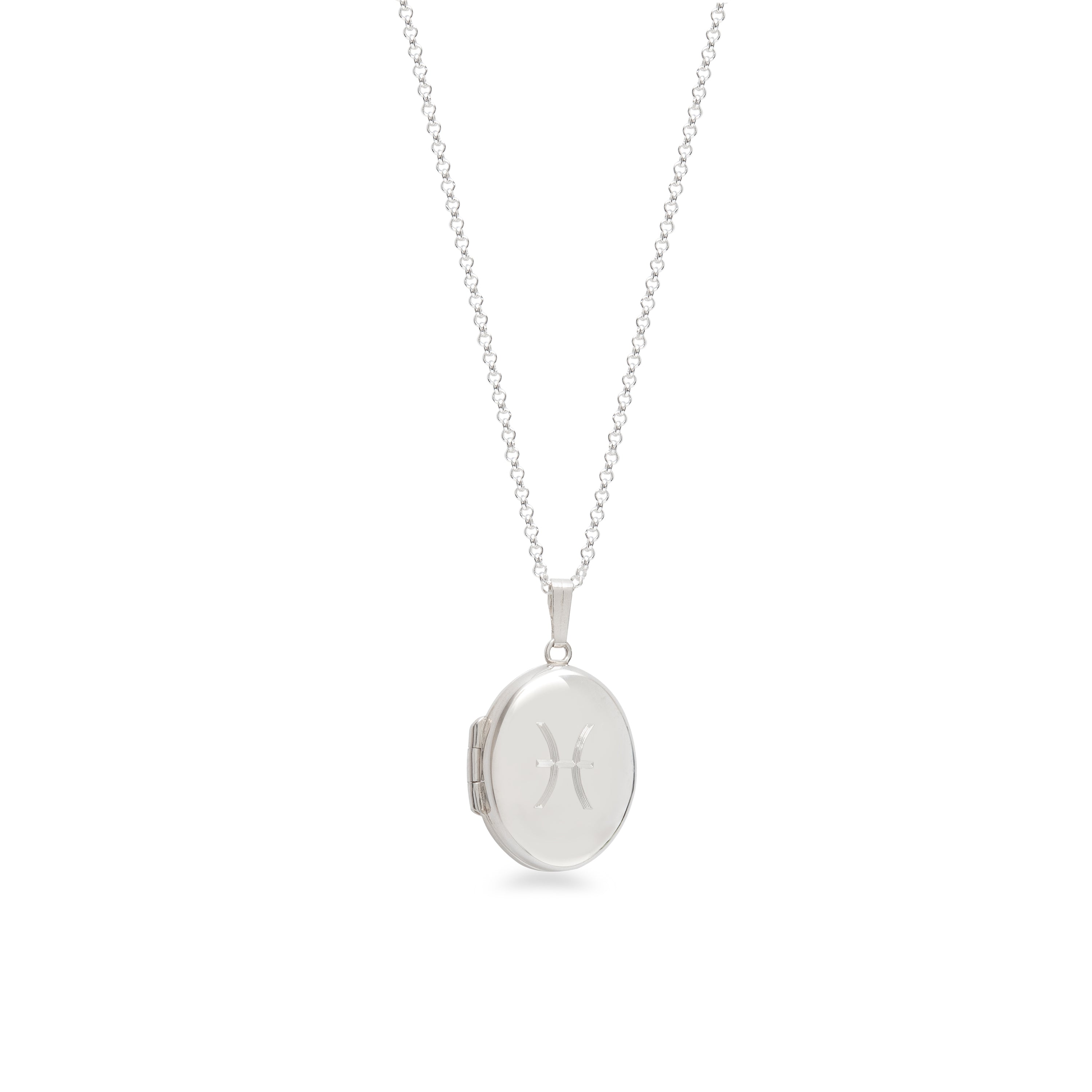 This sterling silver necklace features our oval locket with a zodiac sign engraved on the front.