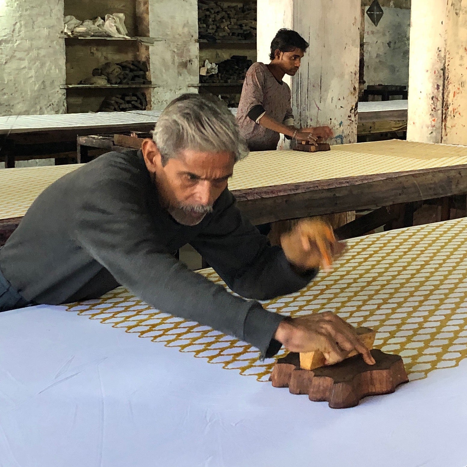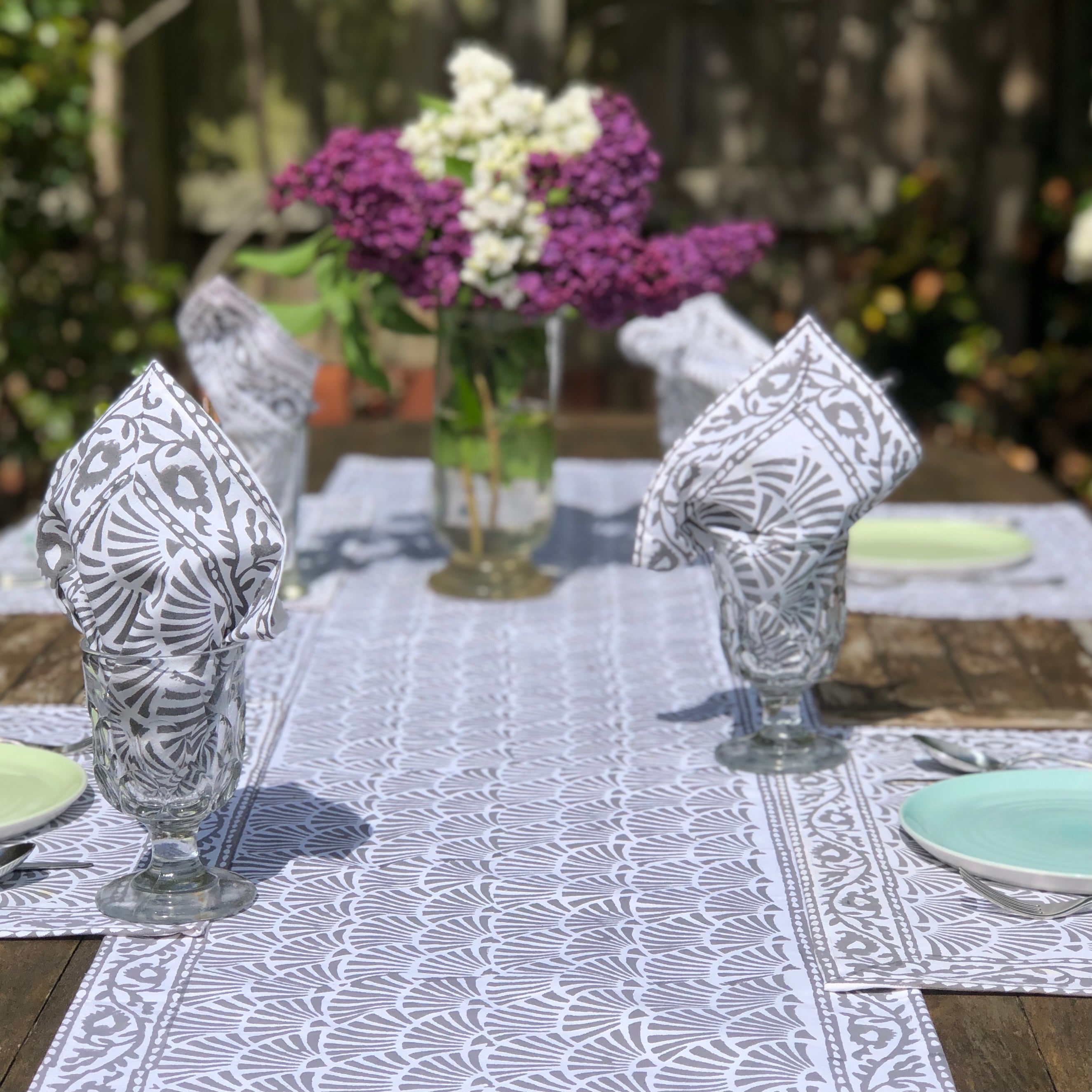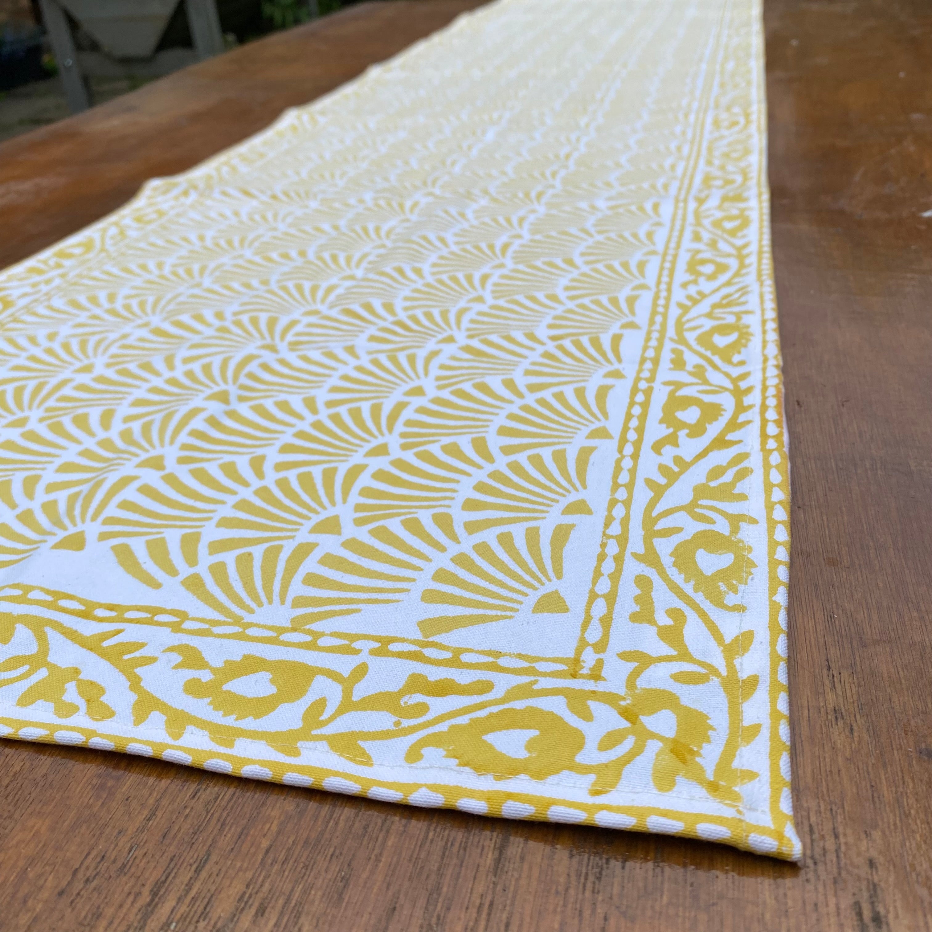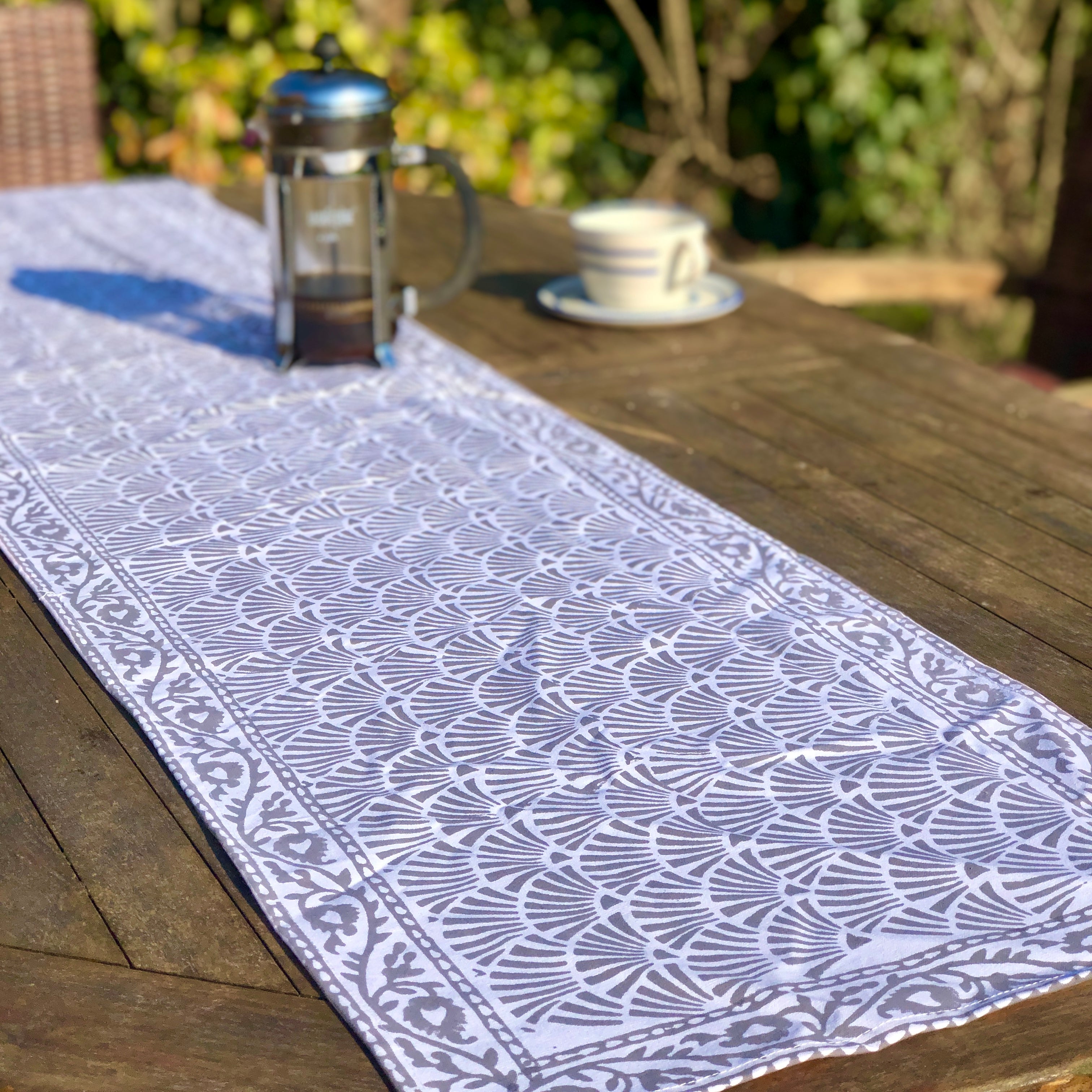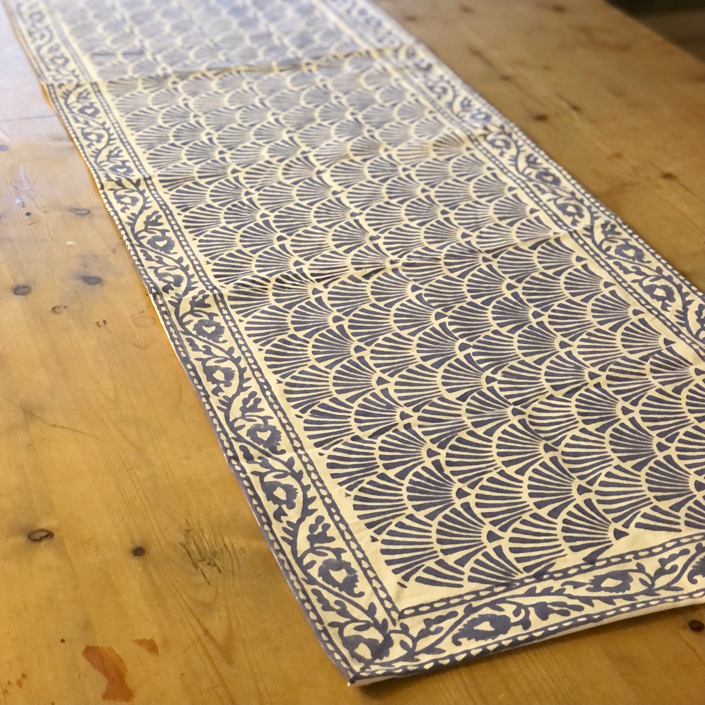 A gorgeous table runner in fabric block-printed using traditional methods in Jaipur.