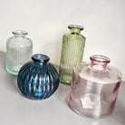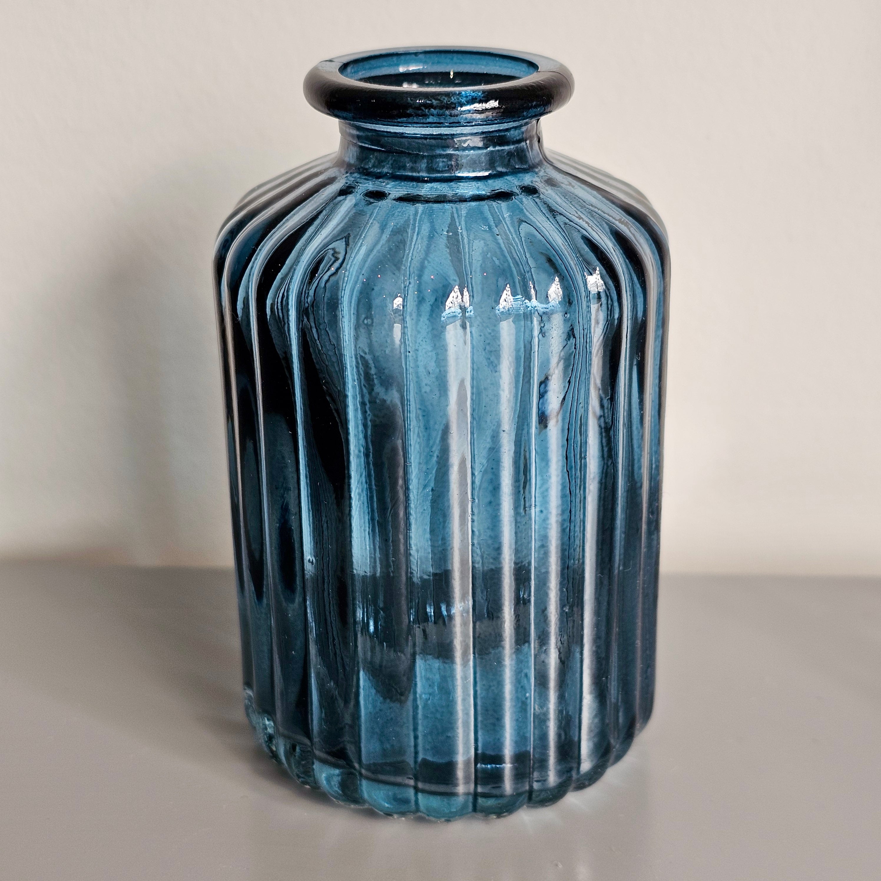 Simple and elegant, this modern and versatile glass bottle from Satchville is the perfect vase for small flower arrangements or diffuser oil. With its deep blue hue and ribbed glass texture, this vase adds a pop of colour to your decor.