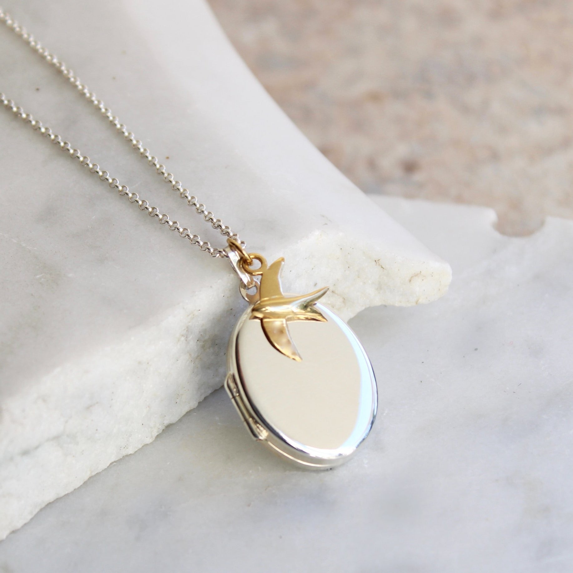 This necklace features our most popular sterling silver oval locket and a stunning swallow charm.