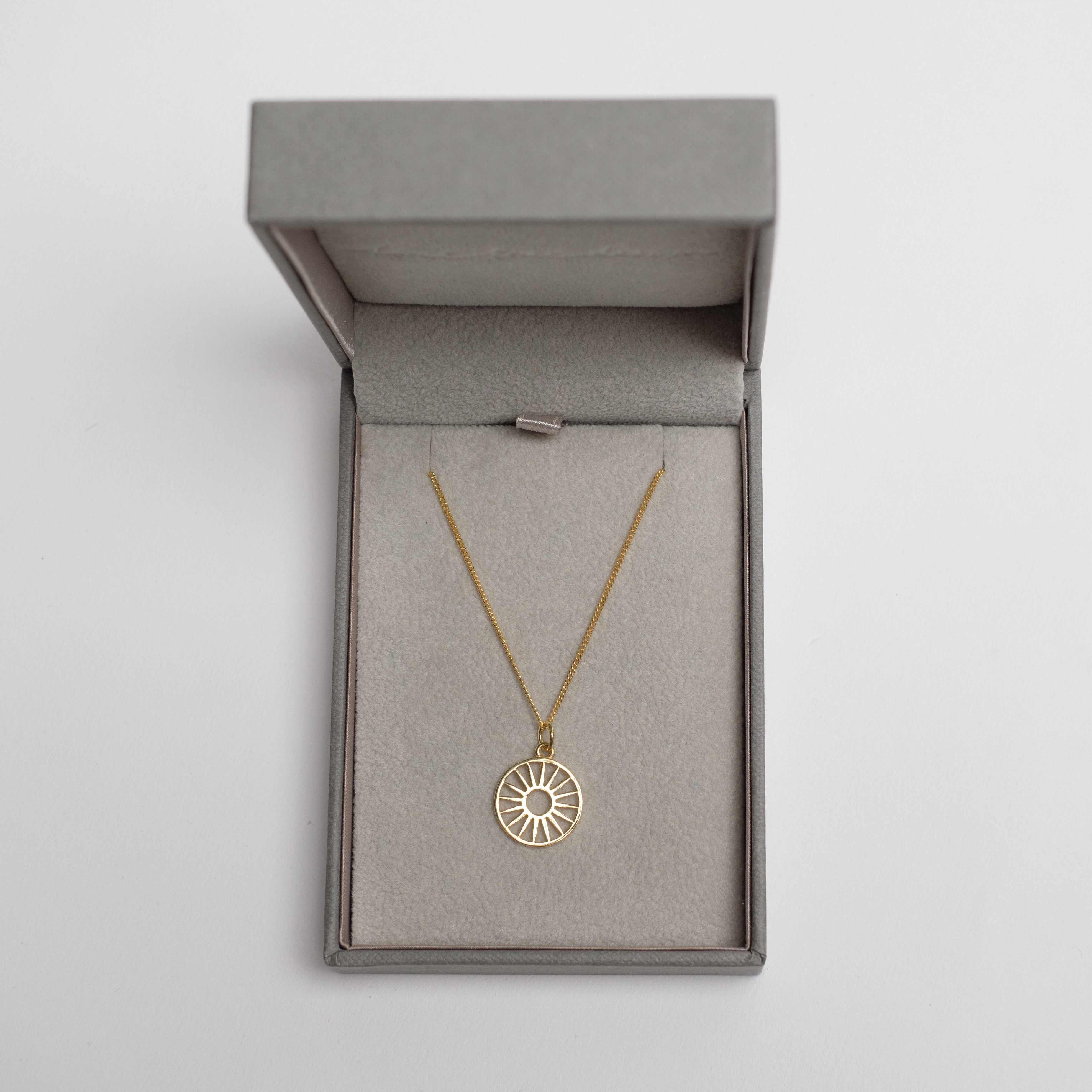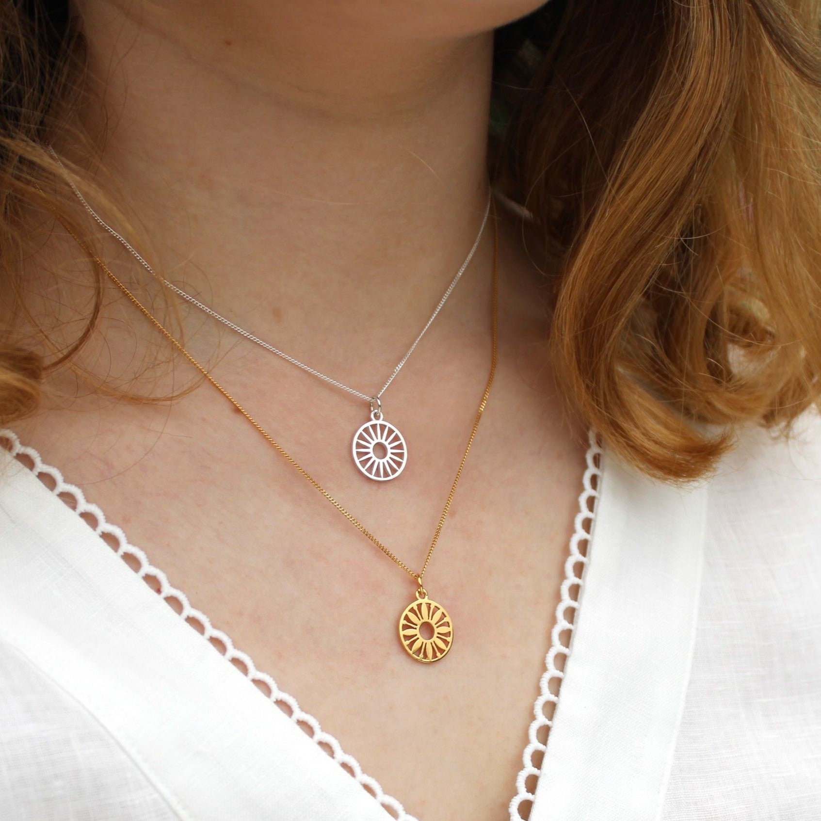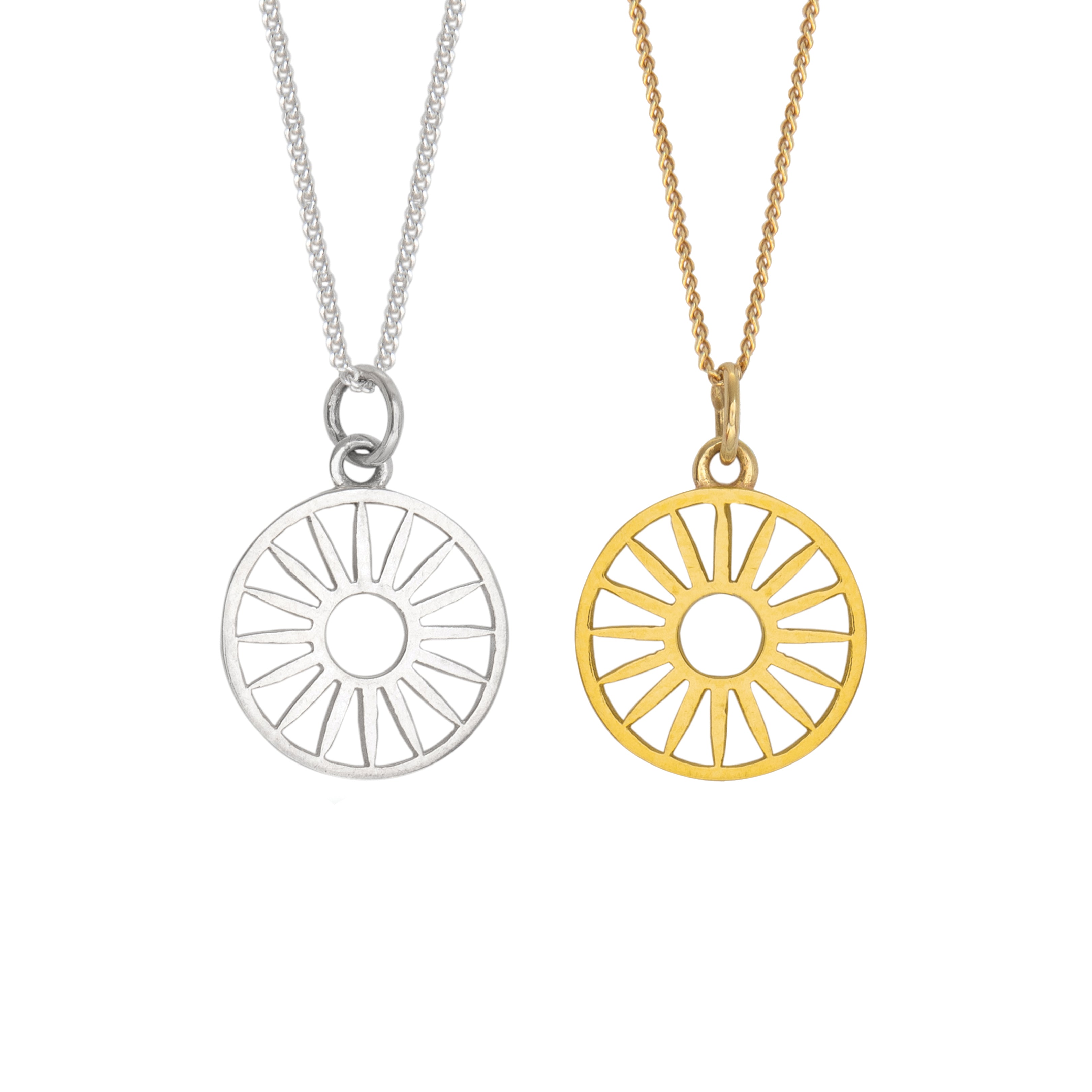 Wagon Wheel Design, Minimalist and Delicate necklace part of our Token collection. Each token was designed by Julia and they catch the light beautifully. They make the perfect necklace for layering. This design features a cut out wagon wheel pattern.The necklace comes boxed. Pendant measures 15mm in diameter. Pendant, chain and fittings are made from gold vermeil. Vermeil is 18 carat gold plated on a sterling silver base. It’s a surface treatment and will fade over time. Be careful with sun cream or perfumes and always remove jewellery before swimming or bathing. Please do not use metal cleaners on vermeil as this may remove the plating. Silver Pendant, chain and fittings are made from sterling silver/925. Please rub with a silver cloth to clean.