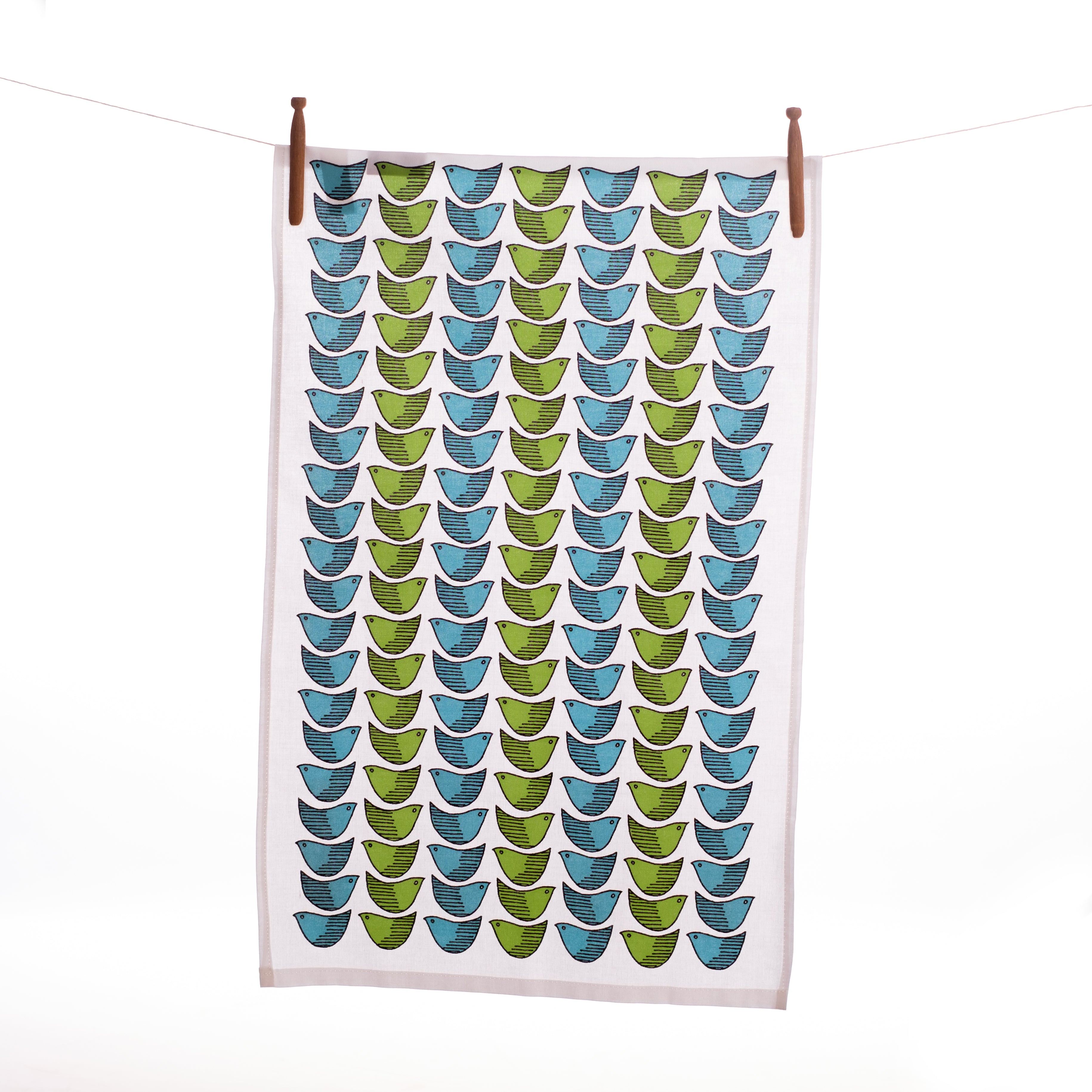A striking tea towel featuring our Lime Tree Design birds in turquoise and lime green on a white background.