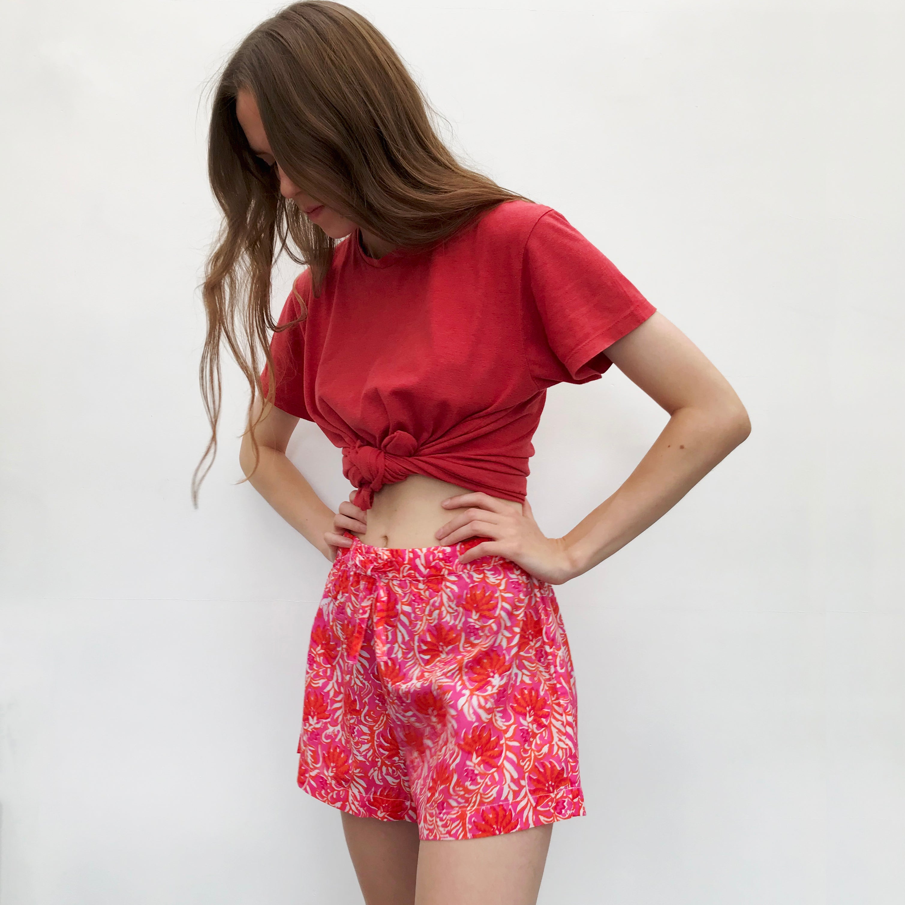 Made from 100% cotton, they are great for sleeping or lounging in, or even wearing to the beach! These magenta & orange shorts are a popular new colourway in our Jaipur fabric. They have a wide elasticated waist with a drawstring to adjust to the perfect size.