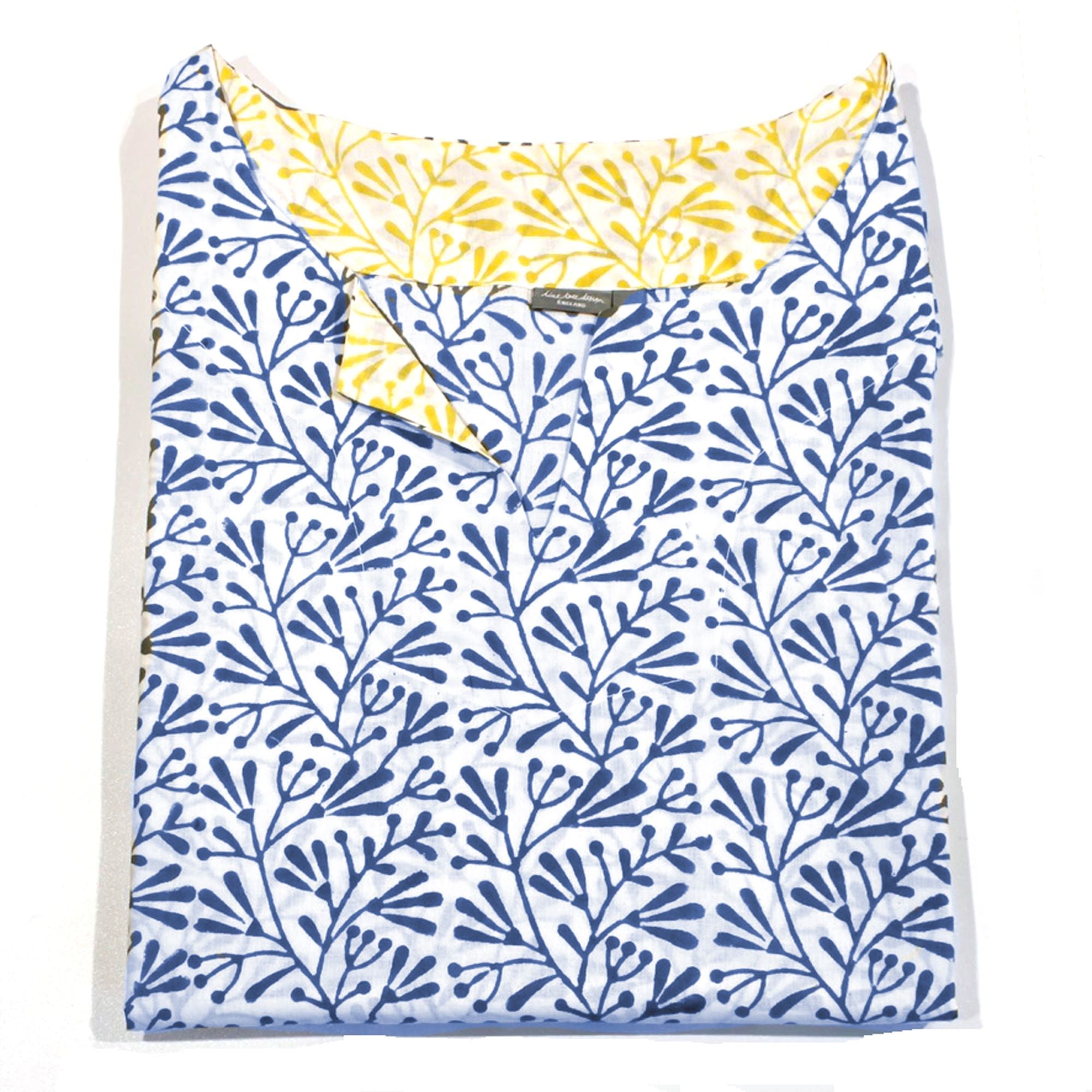 A loose-fitting cotton tunic made with our Lime Tree Design Bud print in blue.