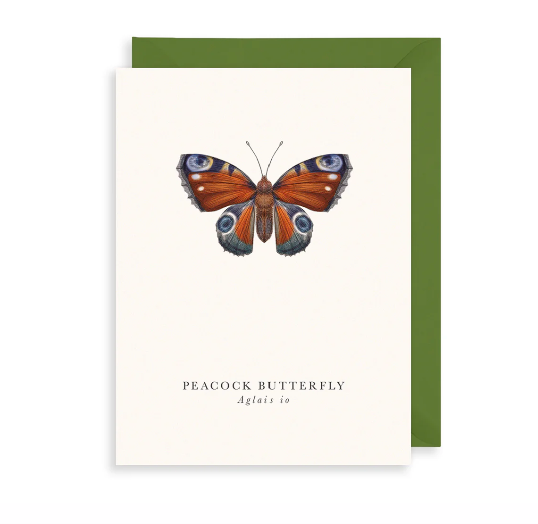 An elegant greeting card with a beautiful illustration of a peacock butterfly with the English and Latin title detailed below the image.