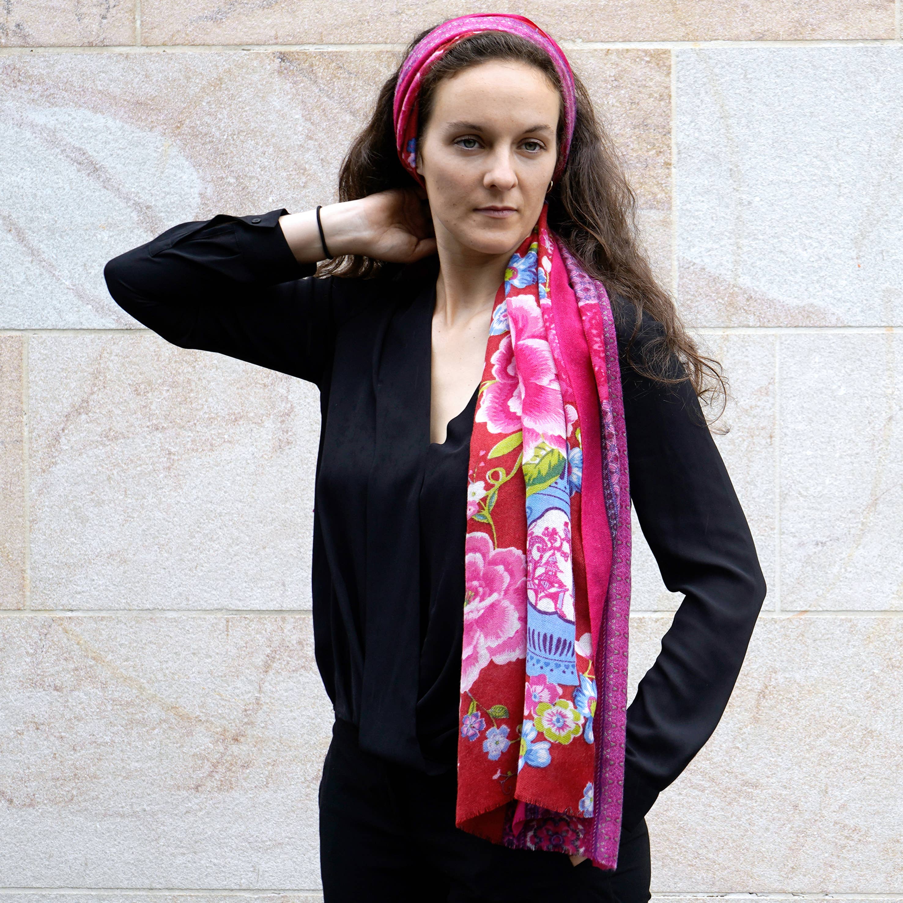 One stole represents 1 or 2 months of drawing, 2 weeks for yarn selection and fabric weaving, 2 days to print, and 3 more days to obtain that “perfect” feel, ultra soft and fully finished.