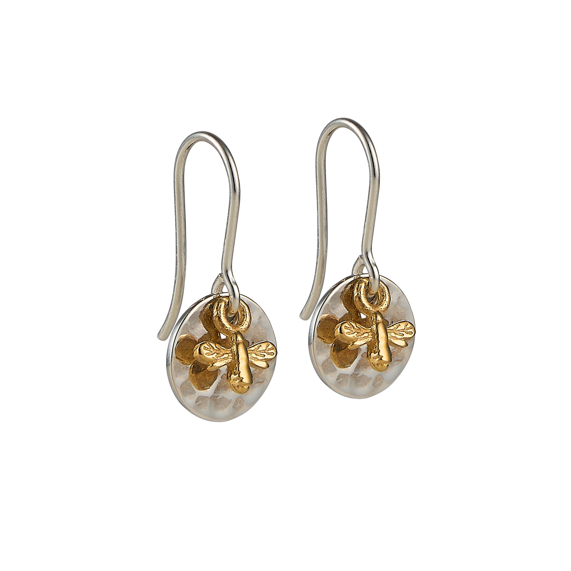 A stylish pair of hammered mini disc hook earrings in sterling silver with mini gold vermeil bee charms.