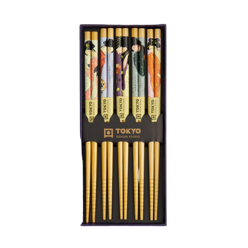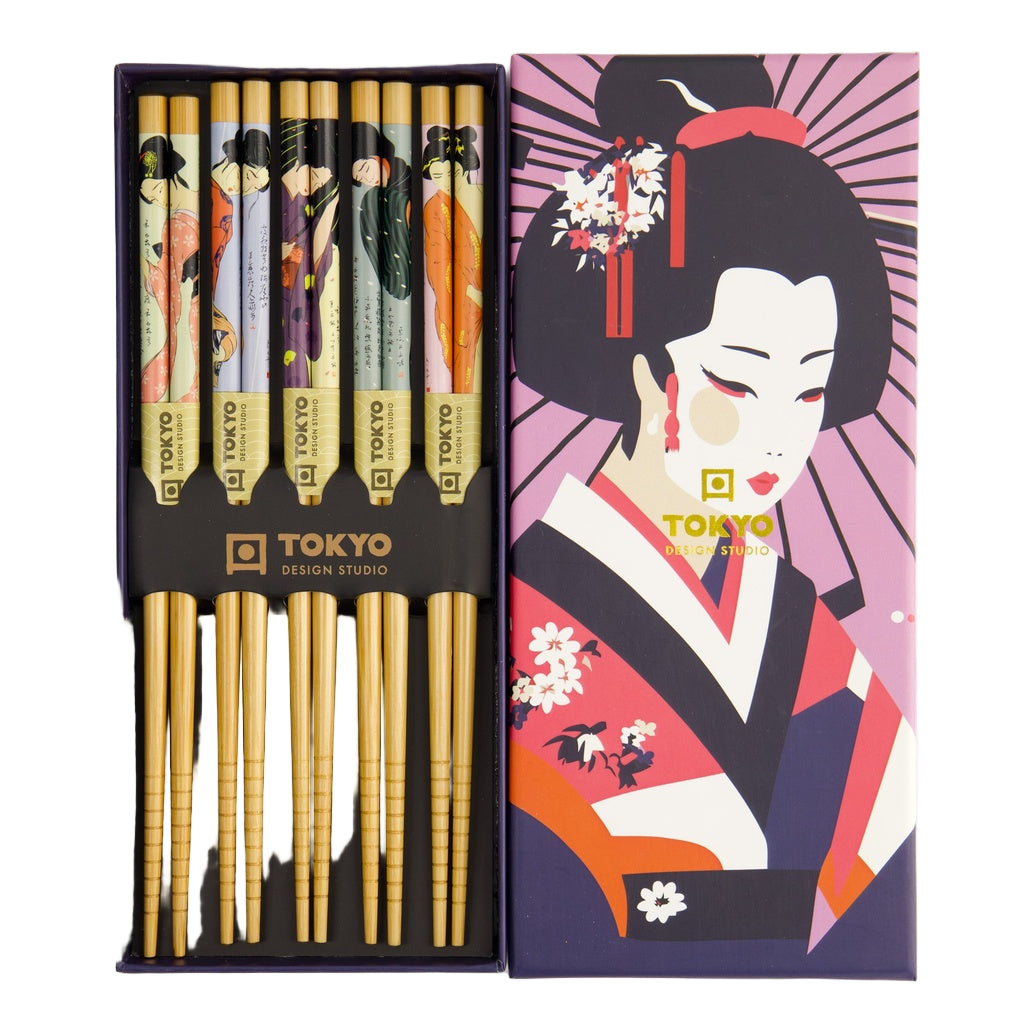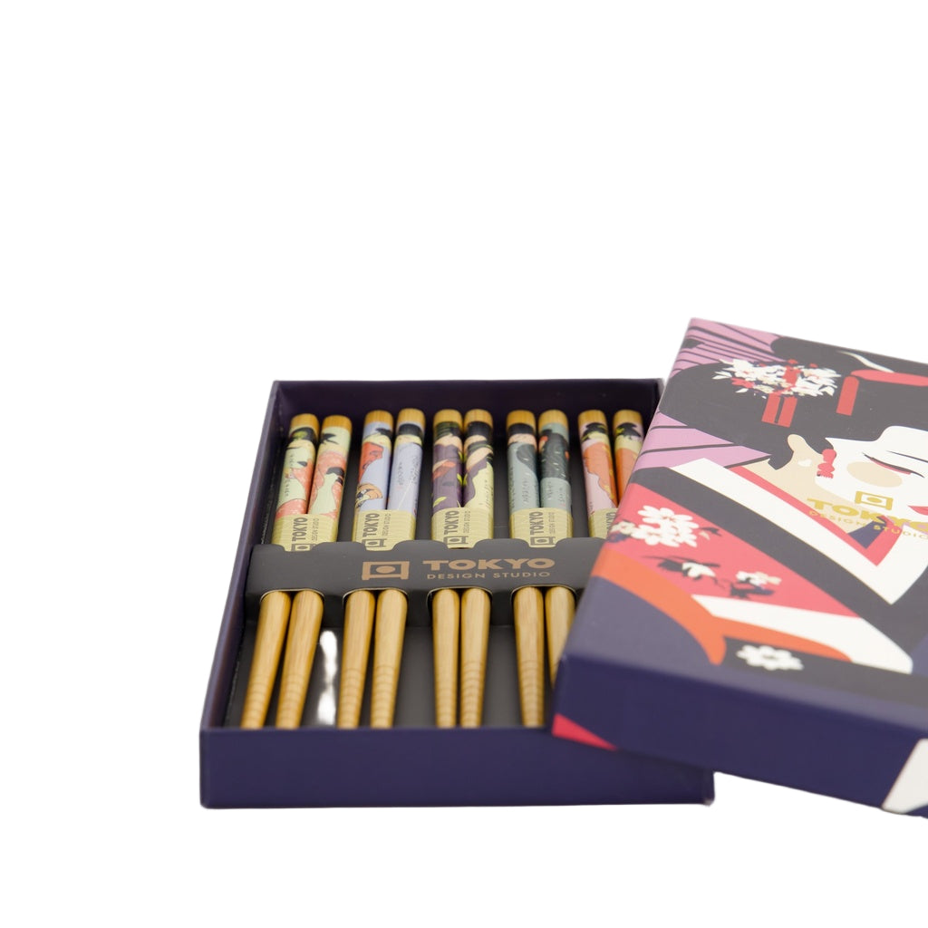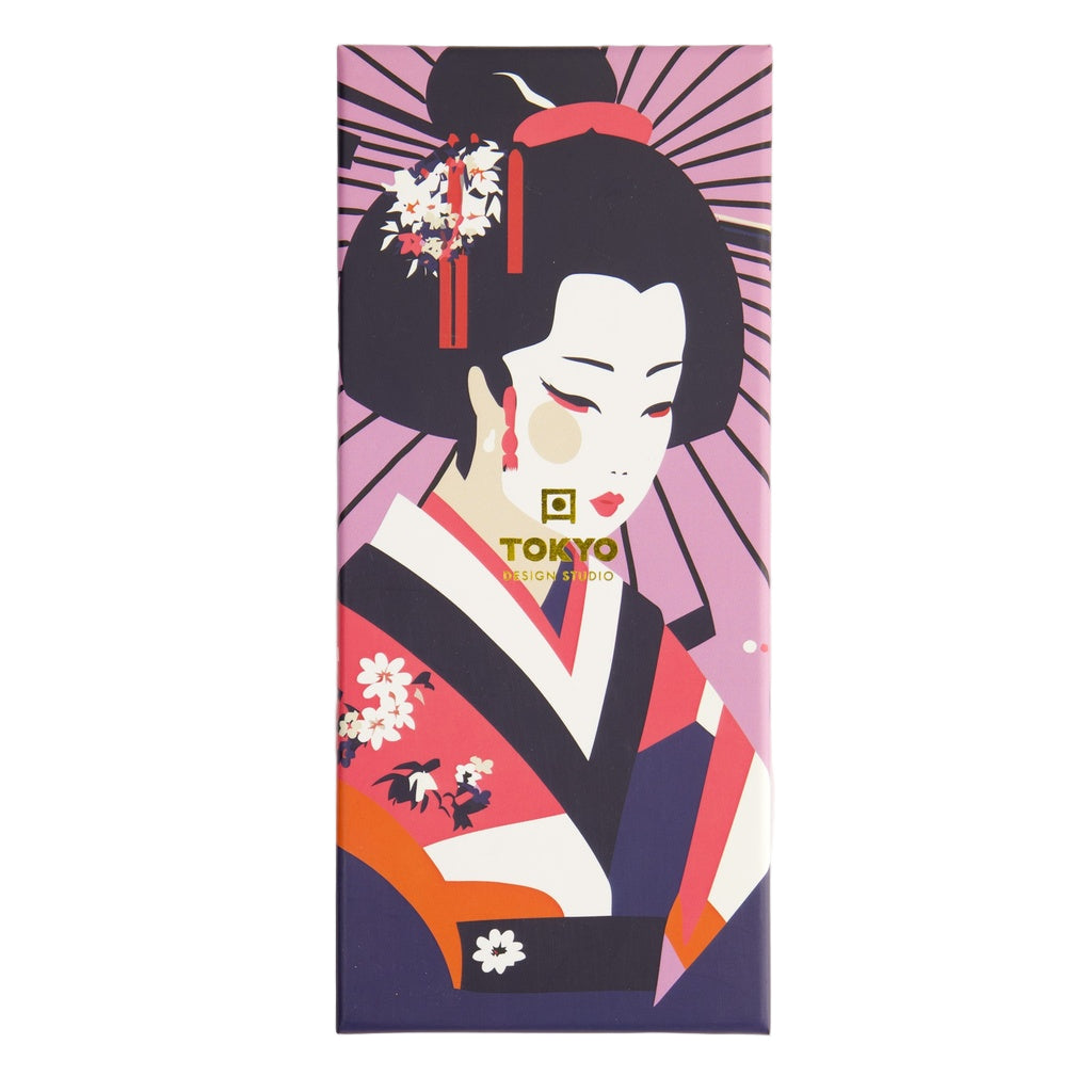 The Tokyo Design Studio Chopstick Giftset with Geisha design in black This set includes five pairs of wooden chopsticks, each measuring 22.5 cm in length, featuring intricate and colourful geisha motifs that celebrate Japanese cultural heritage. The chopsticks are presented in an elegant gift box, making them an ideal present for friends, family, or anyone who appreciates Japanese culture. Please note that these chopsticks are not dishwasher safe; hand washing is recommended to maintain their quality.